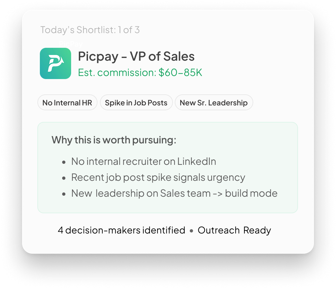 Reachr surfaces high-fit recruiting opportunities in your niche, shows why they matter, and helps you act while they're still worth pursuing.